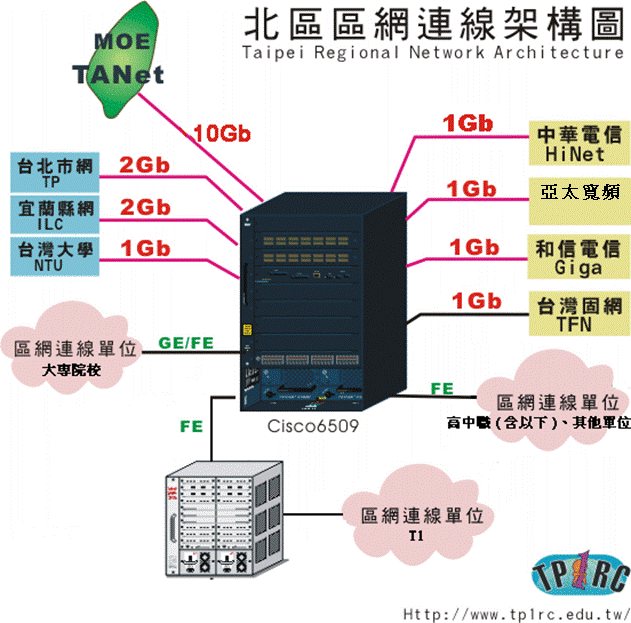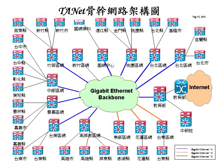 區/縣市教育網路中心整體網路連線架構圖。 對外(含連接骨幹及各級學校)連線設備三台,包括區網對外主幹router一台、連接區網學校兩台。